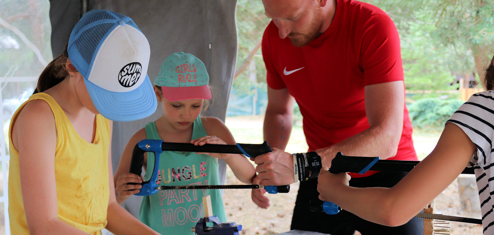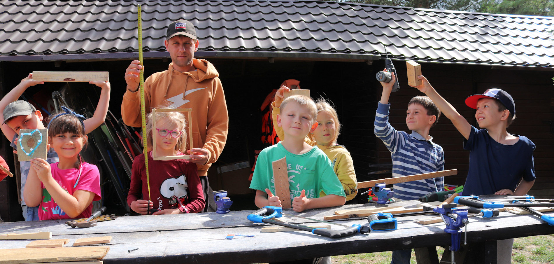 Obozy letnie oraz wycieczki szkolne – zielone szkoły – w naszej Farmie Kalina to także możliwość sprawdzenia się w roli majstra. Mamy w pełni wyposażone stanowiska pracy, dostosowane do każdego wieku i możliwości dziecka. Z dbałości o bezpieczeństwo małych majstrów niektóre elementy przygotowuje instruktor wcześniej lub samodzielnie na oczach dzieci. Te otrzymują zestaw bezpiecznych narzędzi, którymi pod czujnym okiem instruktorów tworzą własne konstrukcje. Wśród nich są m.in.: karmniki dla ptaków, małe stoliki i taborety z zamykanymi skrytkami, niepowtarzalne podstawki na kredki i ołówki, drewniane świeczniki, wieszaki na ubrania czy ramki do zdjęć. Niektóre prace dzieci mogą zabrać ze sobą do domów i cieszyć się z ich wykonania i używania każdego dnia. Dla najbardziej wykwalifikowanych „majstrów” stawiamy wyższą poprzeczkę zlecając im wykonanie drewnianych lampek stołowych LED, które będą ocieplały pokoje w nowym budynku naszego ośrodka.
