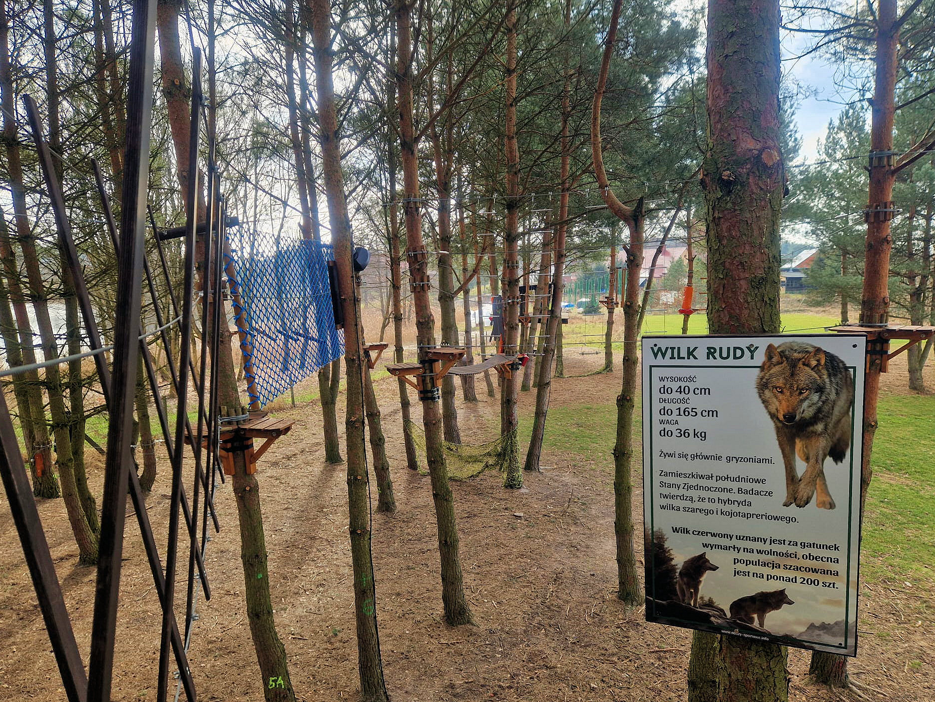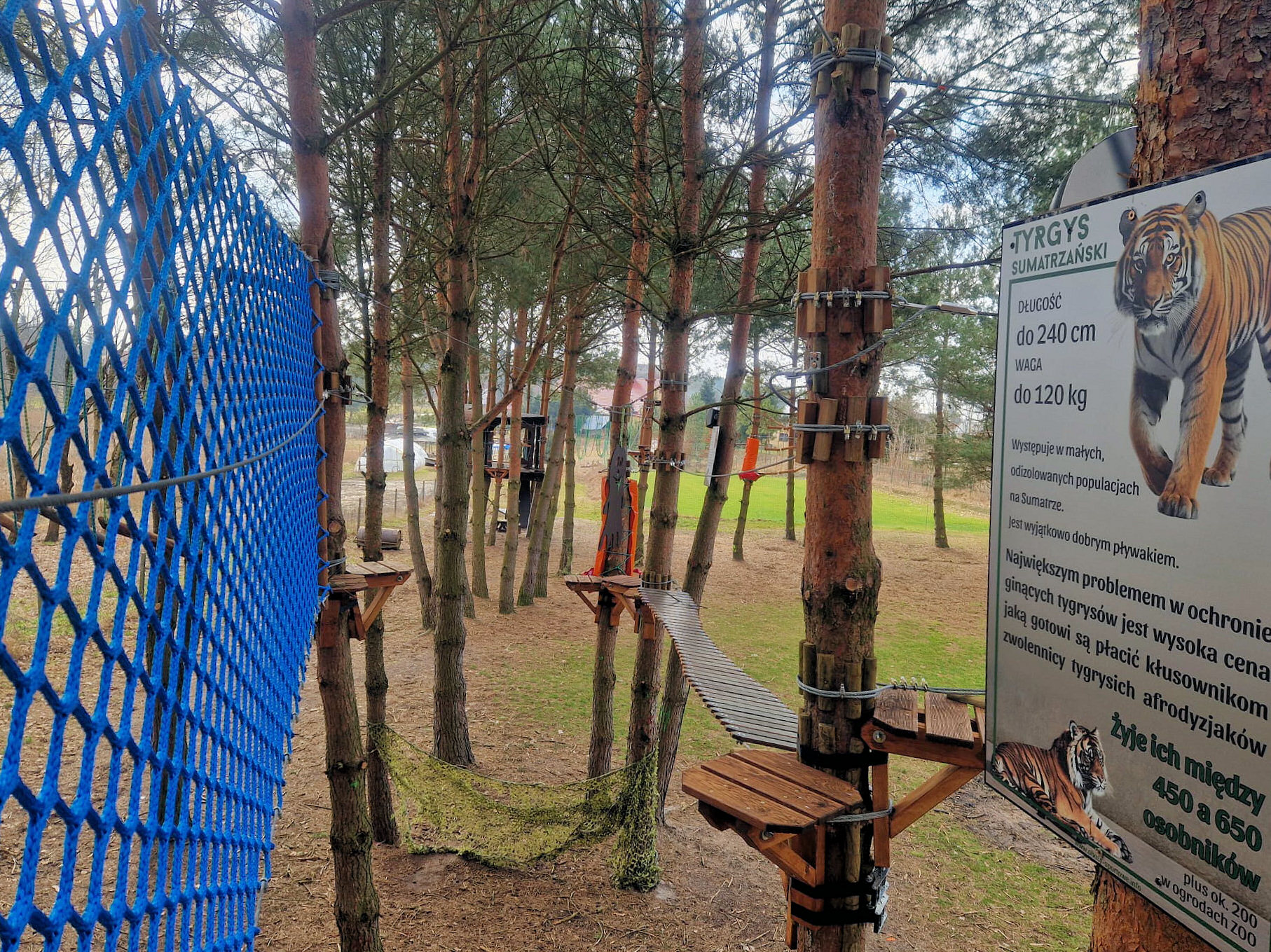 Specjalnie dla was zaprojektowaliśmy i stworzyliśmy unikatową trasę nowego parku linowego, a jej wyjątkowość polega na przyjęciu formy interdyscyplinarnej ścieżki edukacyjnej. Podczas wspinaczki napotkacie na 26 nowych przeszkód oraz 150m zjazdów tyrolskich o różnym stopniu trudności; będziecie mieli okazję poznać 12 gatunków zwierząt z różnych stron świata. Dzięki specjalnemu nagłośnieniu każdy uczestnik będzie słyszał odgłosy spotkanych zwierząt, co sprawi, że poczuje się jak w prawdziwej dżungli, lesie lub na safari. Co więcej park jest zintegrowany z imponującym nadziemnym stanowiskiem