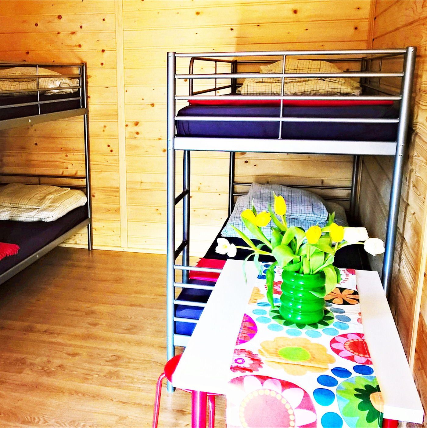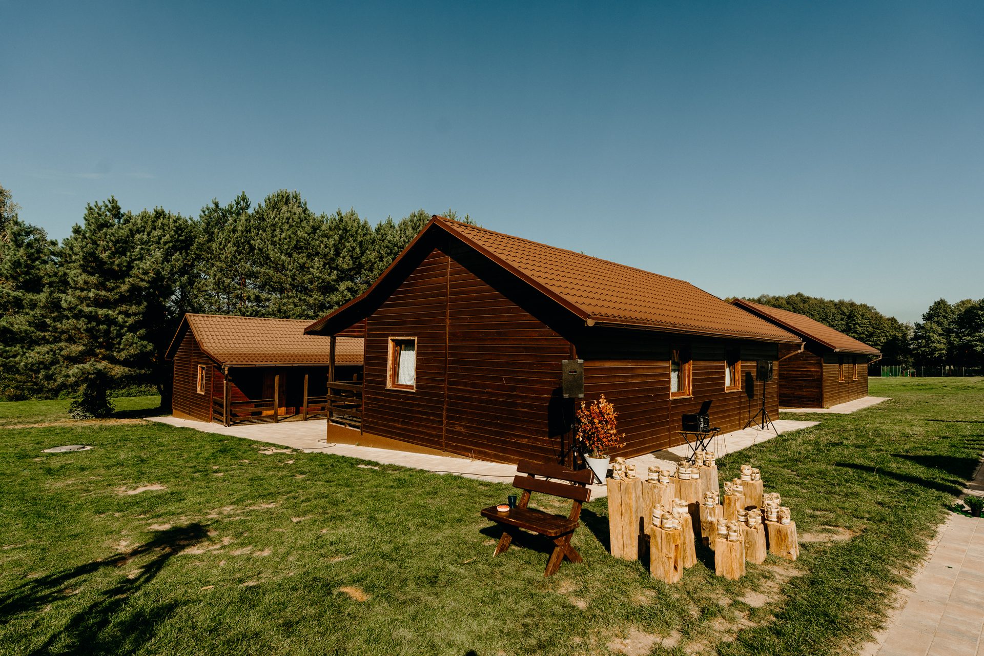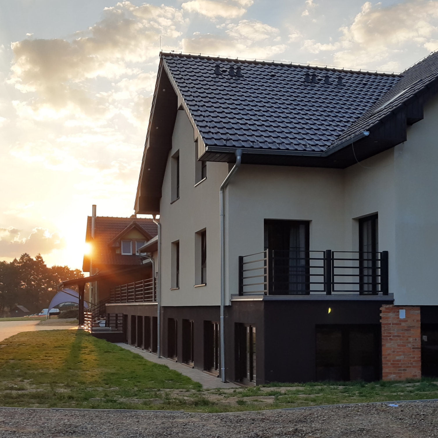 Wysoki standard zakwaterowania. Pokoje 4-8 osobowe z łazienkami (w budynku głównym lub ogrzewanych domkach letniskowych)